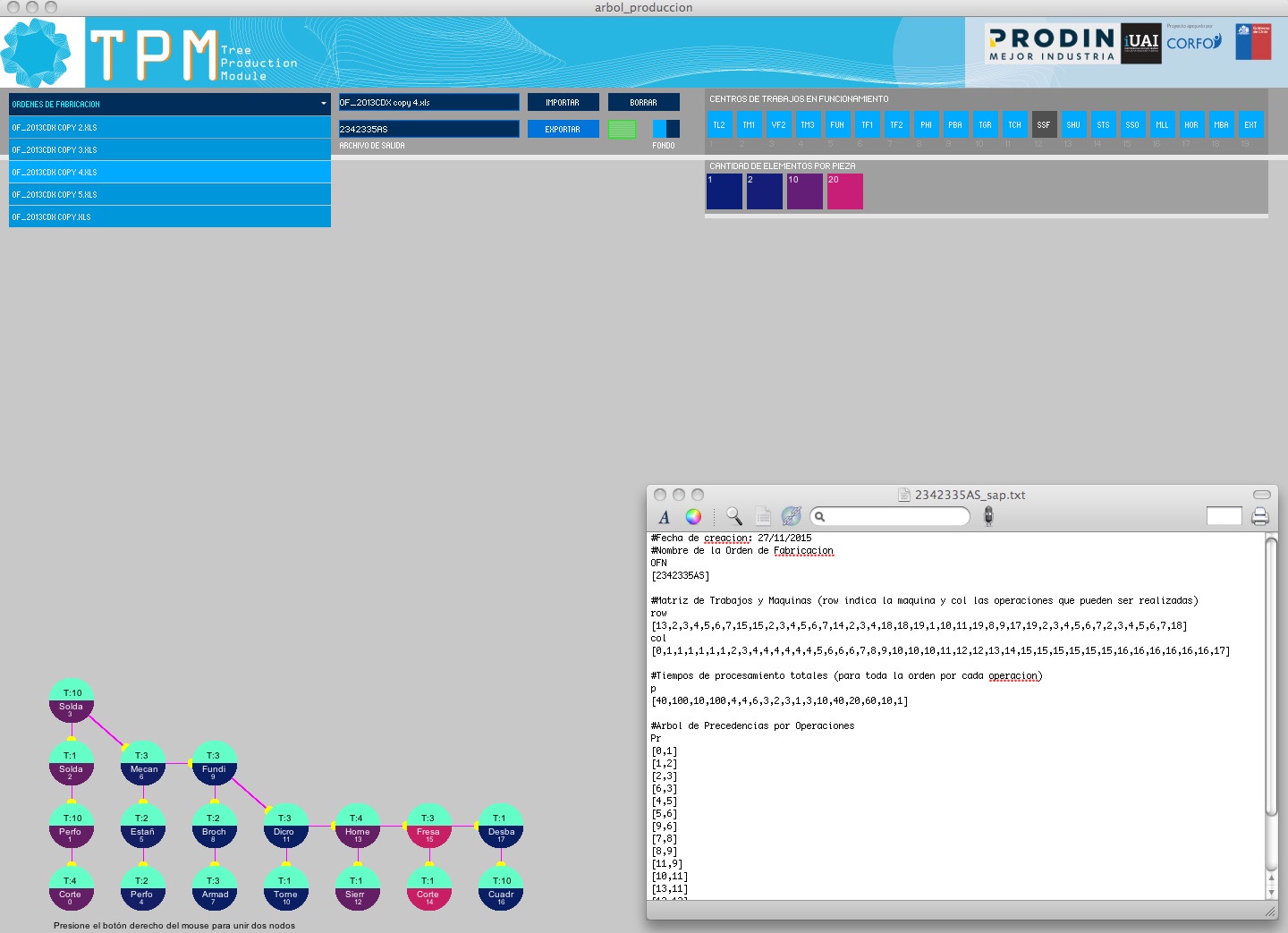 2.1. TPM Module (Tree Production Module): A desktop application that reads XLS files generated by PRODIN from CAD models and transforms them into production trees with precedence relationships between tasks. The engineer manually completes any missing links and exports the result in a format compatible with the planning system (SAP).